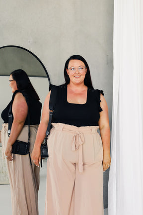 Model Chloe (Beige pants) wears a 4XL & Chest size is 18E.